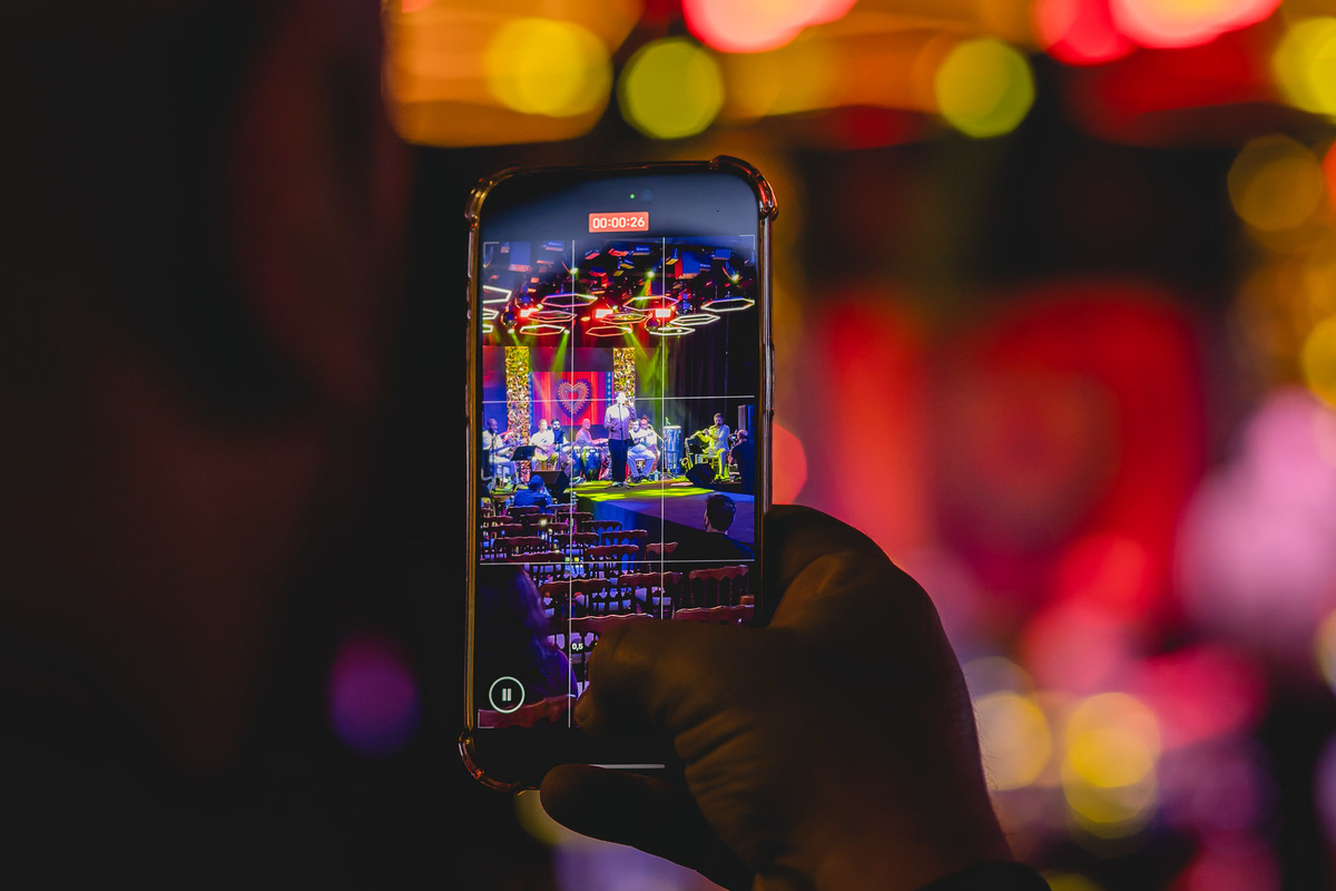Registrar um espetáculo ao vivo em um evento de casamento exige técnica e sensibilidade. A iluminação de palco, com seus contrastes intensos e cores vibrantes, trouxe um clima dramático perfeito para composições criativas.